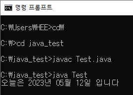 C:\java_test>javac Test.java //Test.java 파일을 컴파일. 오류 메세지가 뜨지 않는다면 정상적으로 컴파일 된 것이다.