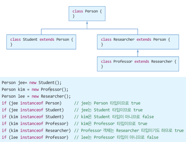 - 레퍼런스가 가리키는 객체의 타입 식별을 위해 사용한다. 슈퍼 클래스는 여러 서브 클래스에 상속되기 때문에 업캐스팅된 레퍼런스로 객체의 타입을 판단하는 것이 어렵기 때문이다.