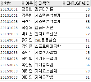 SELECT S.STU_NO AS 학번, S.STU_NAME AS 이름, SUB.SUB_NAME AS 과목명, E.ENR_GRADE