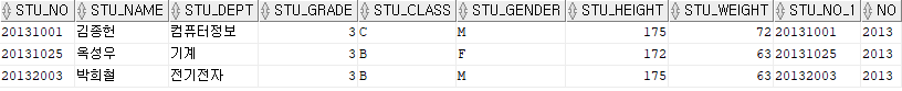 - WHERE 절을 이용하여 받아온 학번이 2013일 값을 출력한다.