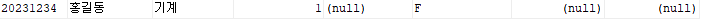 VALUES(20231234, '홍길동', '기계', 1, NULL, 'F', NULL, NULL);