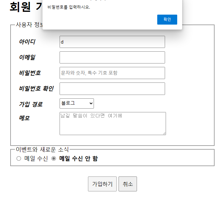 아이디와 비밀번호를 입력하지 않았을 때, 입력하라는 창을 띄우시오.