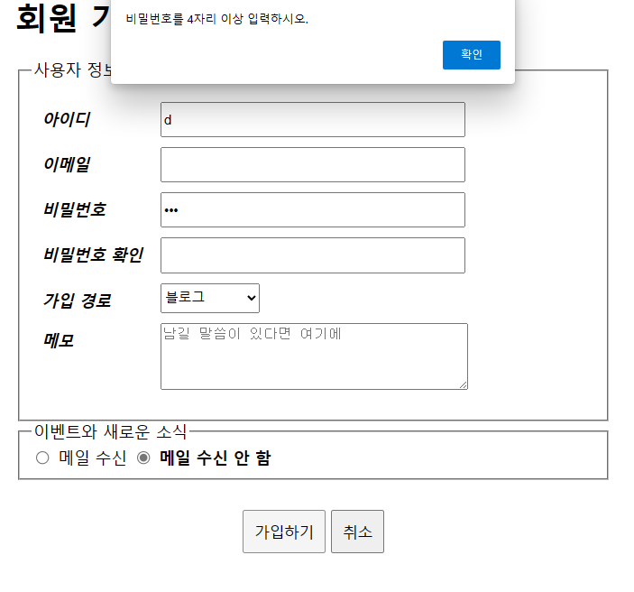 alert("비밀번호를 4자리 이상 입력하시오.");