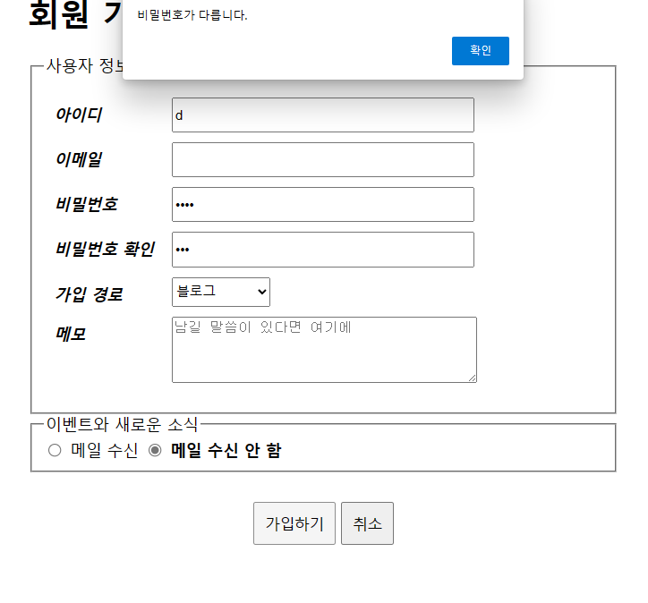 두 개의 비밀번호가 다를 때, 비밀번호가 다르다는 창을 띄우시오.