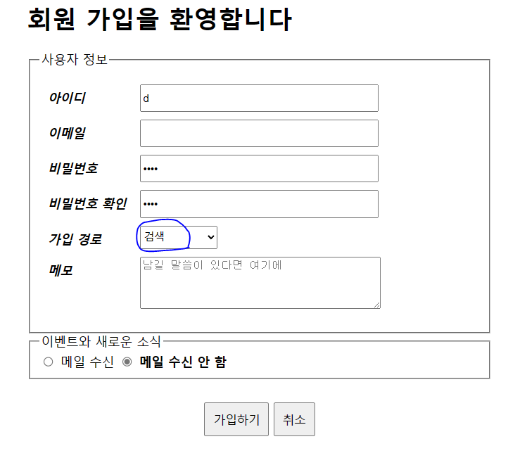 가입 경로가 블로그일 때 블로그는 선택할 수 없다는 창을 띄우고, 가입 경로를 검색으로 바꾸시오.