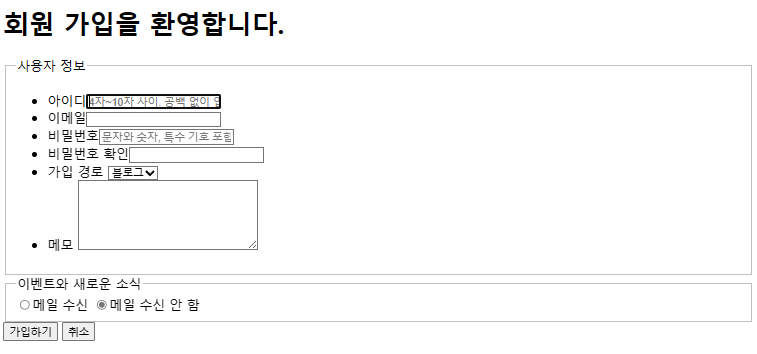 사용자가 내용을 입력할 필드를 삽입한다. 닫을 필요가 없다. <label> |