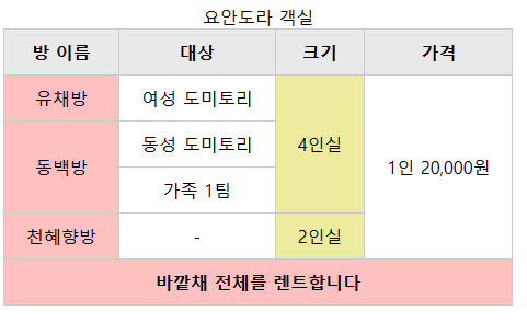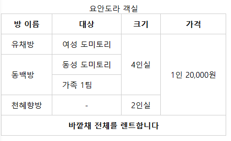 <td colspan="4" style="text-align: center;"><strong>바깥채 전체를 렌트합니다</strong></td>
