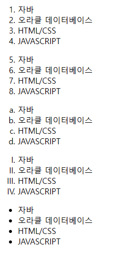 | <ol> | 규칙성이 있는 목록의 시작과 끝을 나타낸다. type을 지정해줄 수 있다. |