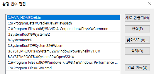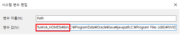 변수값 : %JAVA_HOME%\bin // 맨 끝에 ';'빼고 입력한 뒤에 맨 위로 위치. 위로 이동하면서 자동으로 ';'가 뒤에 붙기 때문.