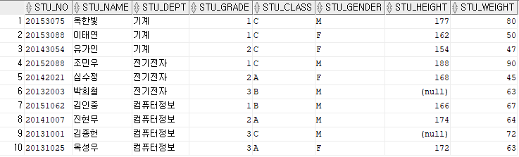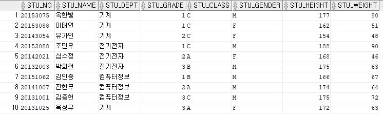 1. STUDENT 테이블에서 기계과 이면서 키가 170 이상인 학생 조회 ▶ 코드 SELECT STU_NAME FROM STUDENT WHERE STU_DEPT IN ('기계') AND STU_HEIGHT >= 170; ▶ 출력 결과 2. STUDENT 테이블에서 반(STU_CLASS)가 A이거나 B인 학